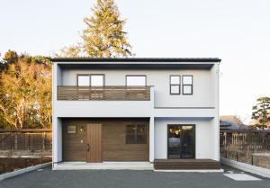 塗壁にナチュラルな板張りの外観、屋内と屋外をつなぐ木製デッキを設けました。