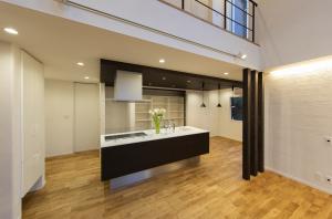 大きな吹抜に鉄骨階段、フレンチウインドゥ・そしてこだわりのバーカウンターのようなキッチン。