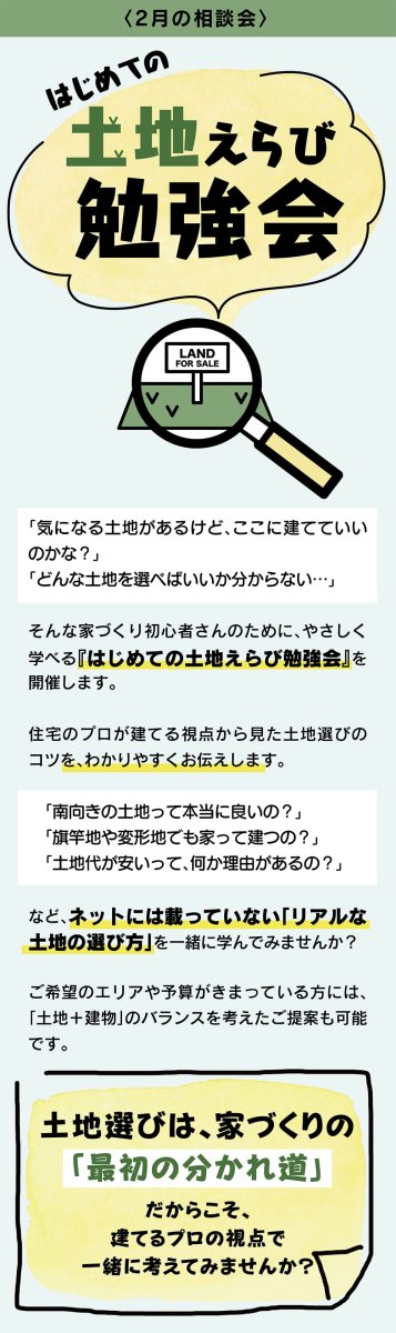 家づくり初心者向け「はじめての土地えらび勉強会」。プロが南向きや旗竿地などネットにない土地選びのコツを解説。エリアや予算に合わせた提案も可能。