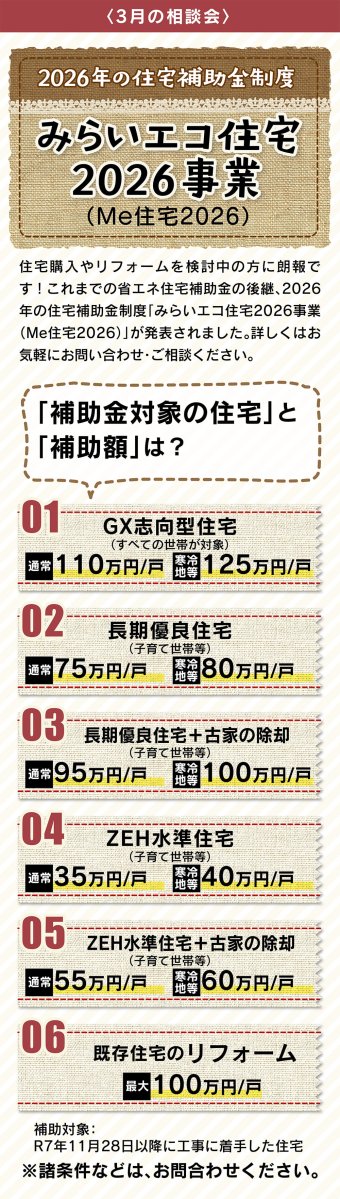 住宅購入やリフォームを検討中の方必見。省エネ住宅補助金の後継となる「みらいエコ住宅2026事業(Me住宅2026)」が発表されました。2026年の補助金制度について、詳しくはお気軽にご相談ください。